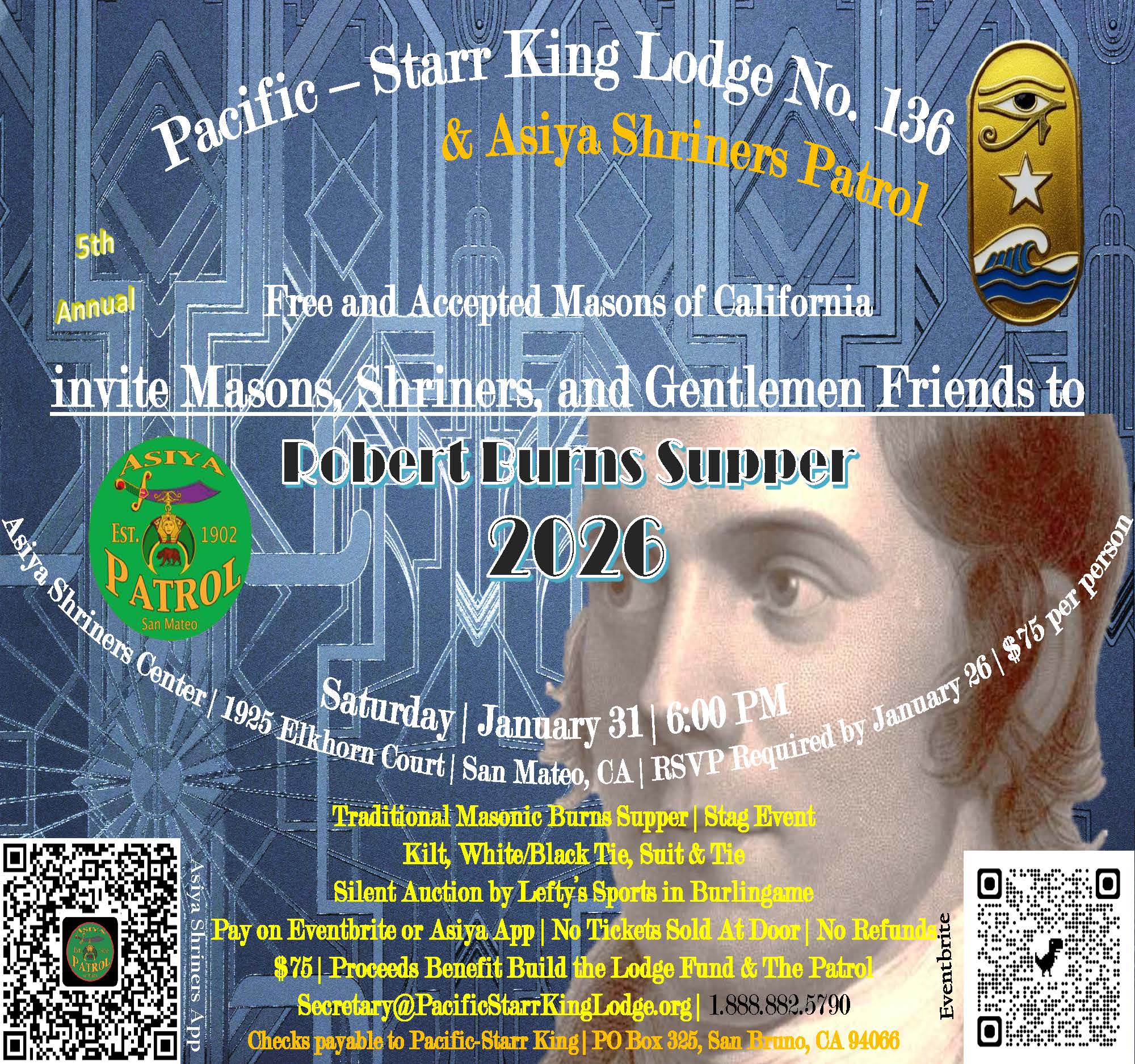 RSVP Required by January 26th: Use either Asiya Shriners App OR Eventbrite at top of page for payment. No tickets will be sold at the door, no refunds.
